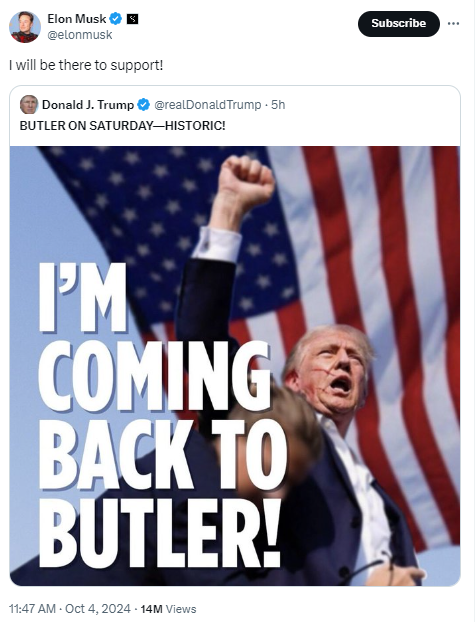 亿万富豪埃隆·马斯克表示,特朗他将参加共和党总统候选人唐纳德·特朗普周六在宾夕法尼亚州butler的普周一个集会,这也是将回击地特朗普遭遇首次刺杀图谋的地点。